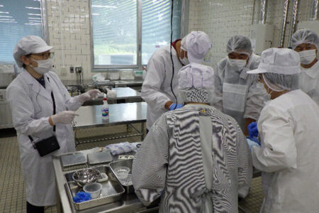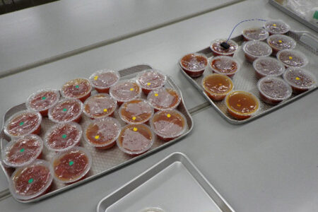 続いて実習では、トマトケチャップ、ゼリー、ジャム、ドレッシングを作成し、HACCPの考え方に基づく注意点や、水分活性・pHの重要性、各種測定機器の使用方法について学びました。トマトピューレーの加熱濃縮や加工品の充填・密封後は、危険温度帯を避けるためブラストチラーで冷却し、最後に加熱殺菌を行いましたが、品温が低く設定温度に達しなかったことから、商品開発では事前の十分な検証が必要であることも説明しました。また、受講生が持参した加工品について糖度計やpH計で測定を行い、製造工程中の適切な測定が品質と安全性の確保につながることを学びました。